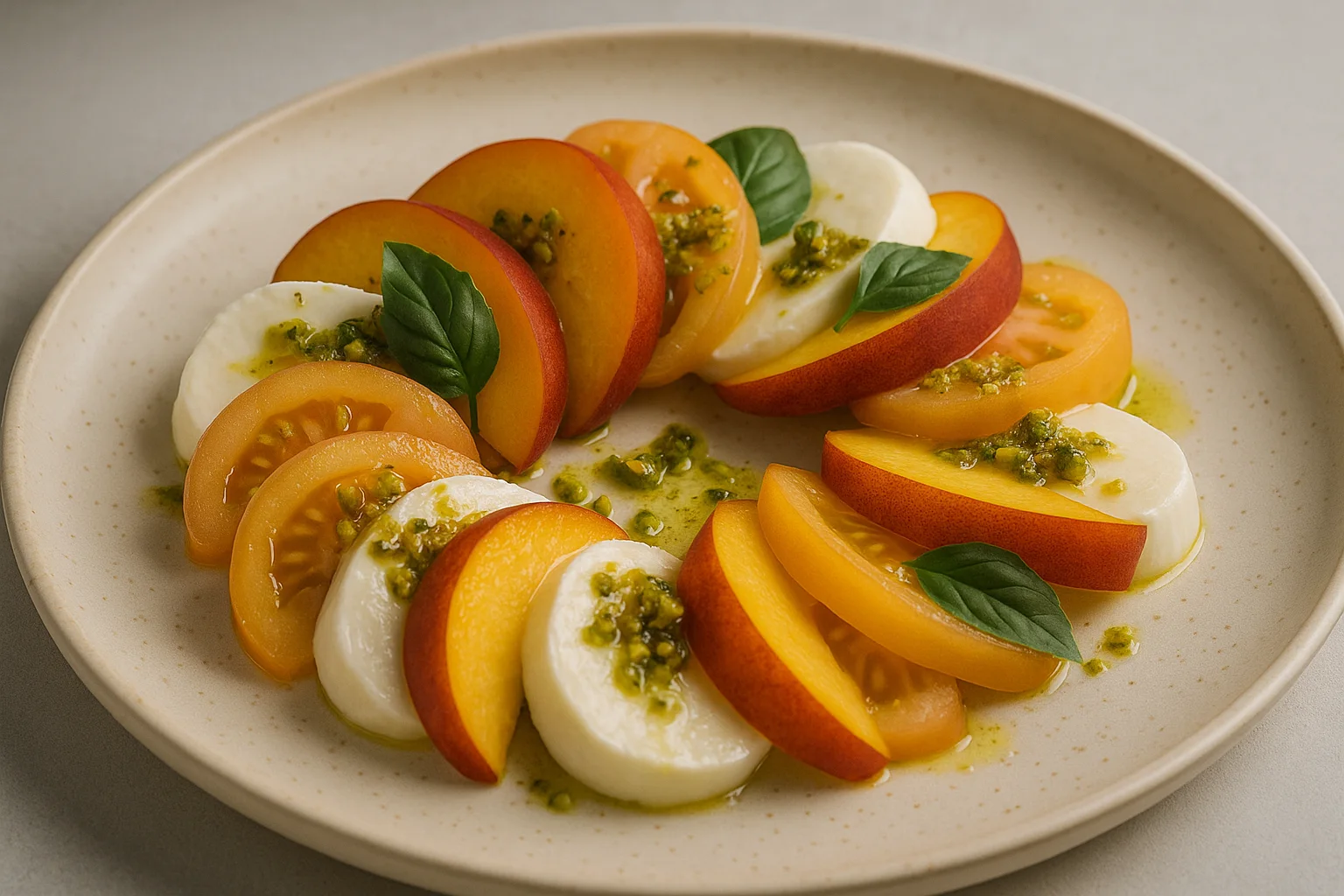 - Tagliate prima la pesca a metà e poi a fette, stessa cosa per il pomodoro e per il Fiordilatte.