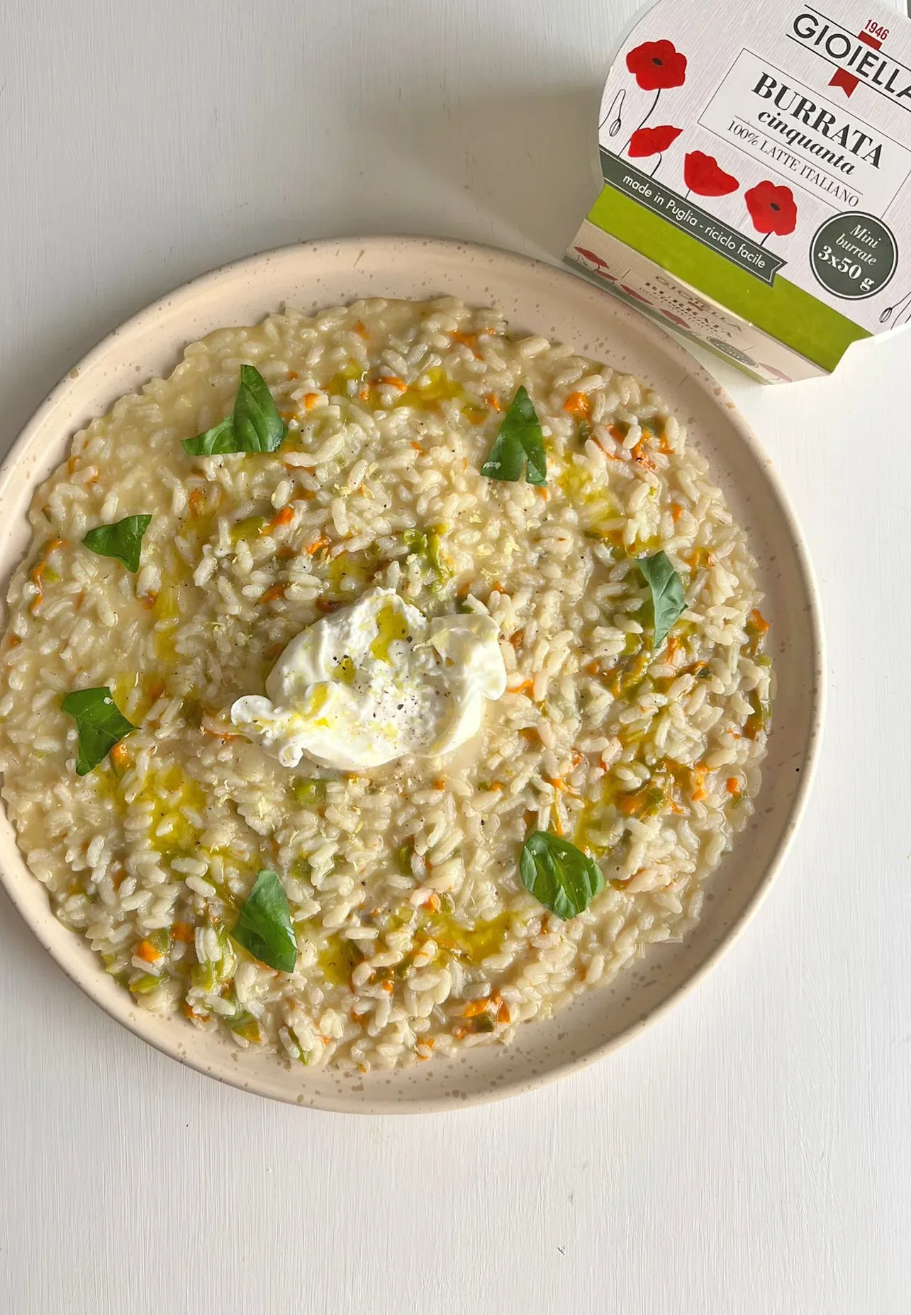 - Servite con una burrata al centro, spaccata a metà, scorza di limone e pepe nero.